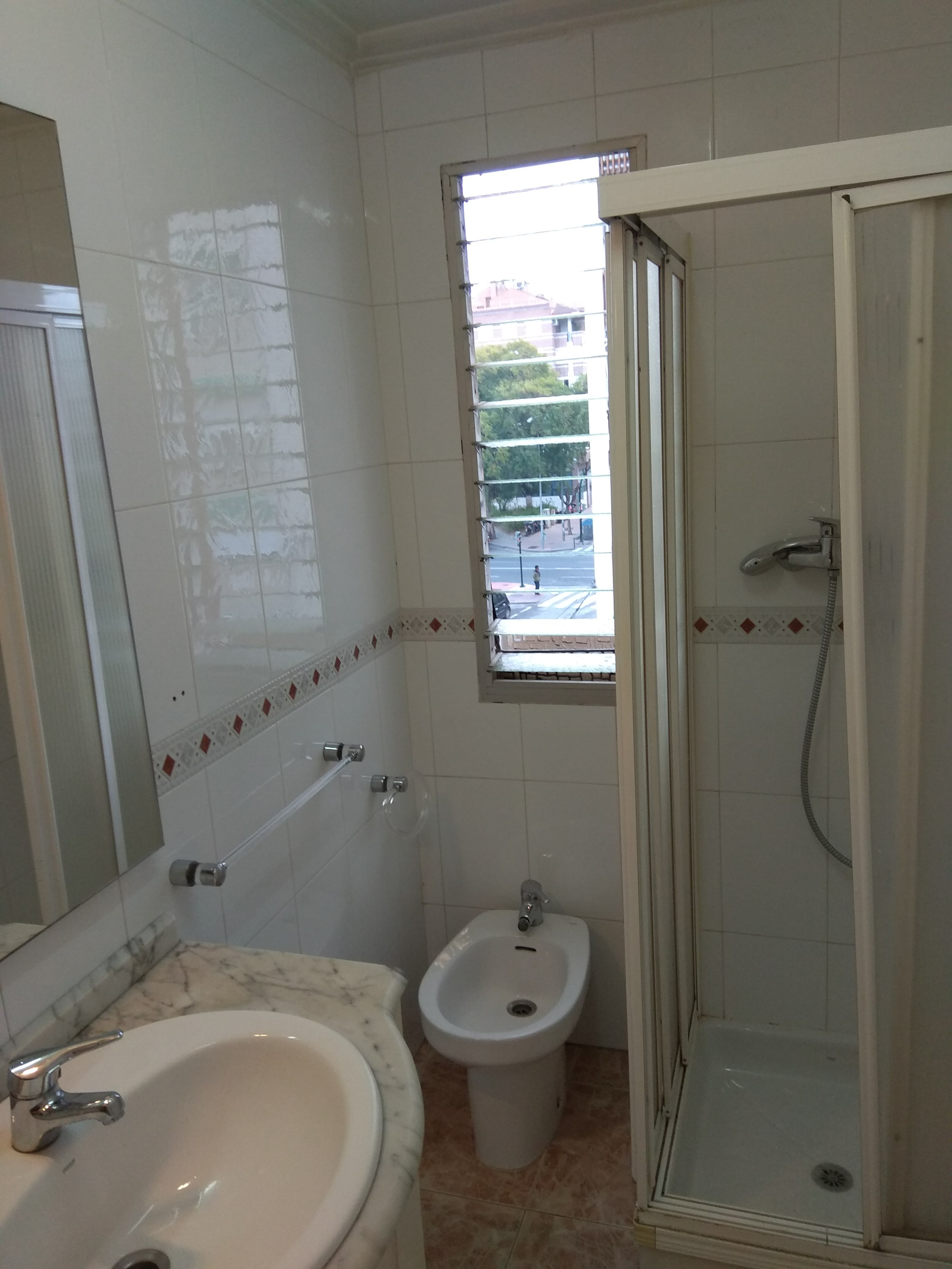 Para que todo te quede claro, hablemos también de la disposición de los elementos en el pequeño espacio de este baño. El bidet está marginado en un rincón entre la ducha y la pared, y eso hace que sea más complicado – para no decir incómodo – utilizarlo. La ventana interrumpe el dibujo de la cenefa y, si bien deja entrar mucha luz gracias a su persiana de vidrio con elementos ajustables, le resta centímetros a la pared, aumentando la sensación de estar en una habitación de dimensiones reducidas.