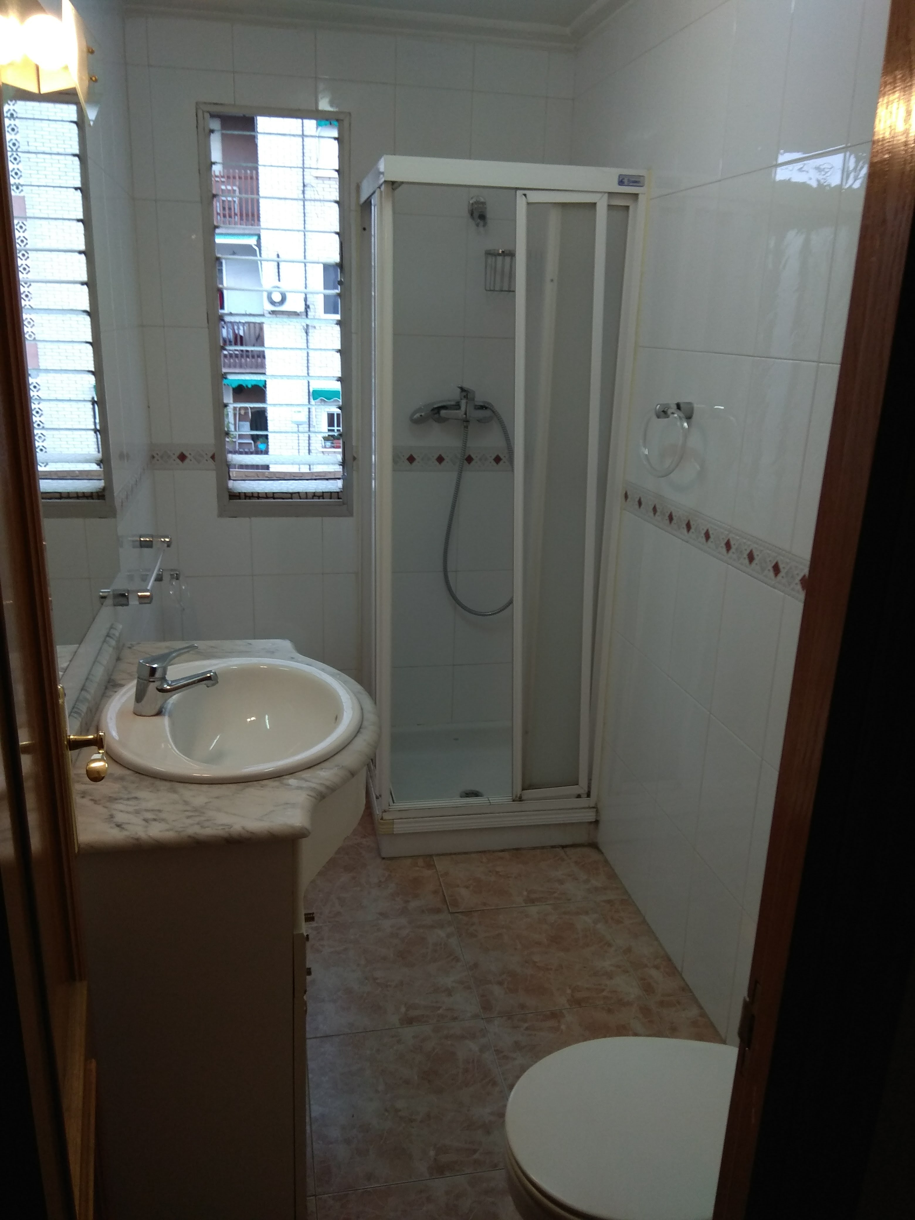 El caso de hoy tiene que ver con un cuarto de baño pequeño y algo antiguo. Más precisamente, se remonta a los años ’90, y lo delatan prácticamente todos sus elementos, empezando por las baldosas. El suelo y las paredes están cubiertos por azulejos de distintos materiales, color y acabado, pero sobre todo hay una cenefa partiendo visualmente en dos las paredes – ¡no hay nada más noventero que una cenefa!