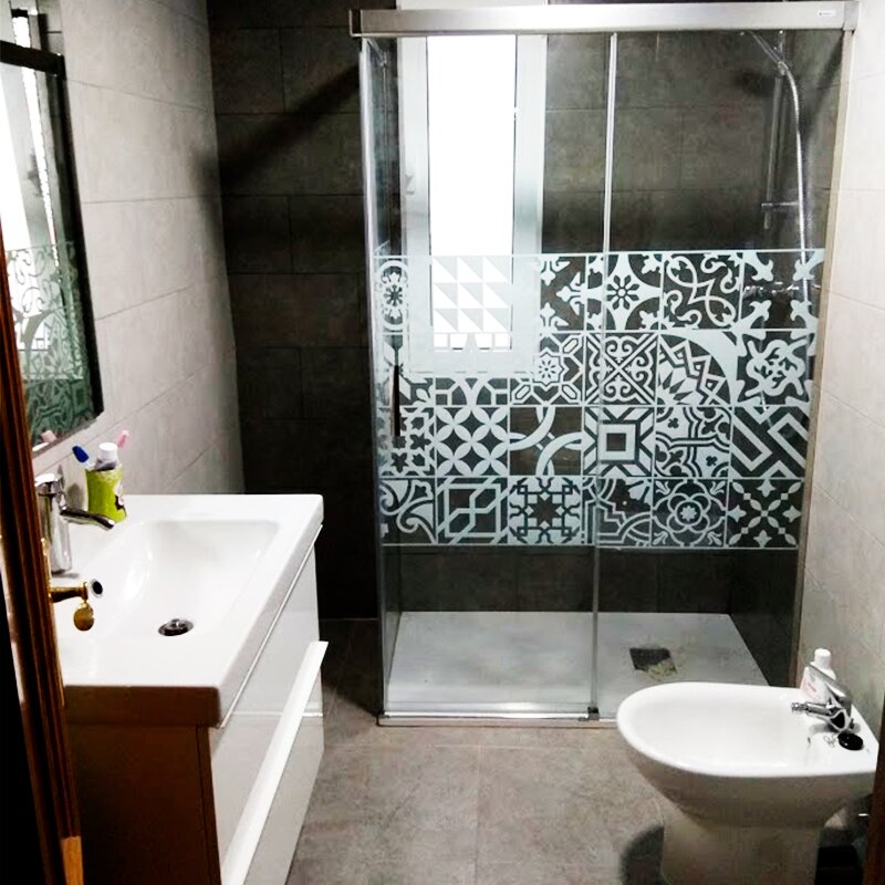 Y ahora la ducha. ¡Cómo nos gusta la nueva ducha de este cuartito de baño! No cabe duda de que es la protagonista indiscutible de esta reforma y del mismo baño. Ancha y a ras del suelo, realizada en vidrio y aluminio, está acotada por una mampara de cristal que agranda la sensación de espacio, embellecida por una decoración tipo azulejos portugueses geométricos y estilizados, y en color neutro. La grifería moderna – que ahora está colocada en el lateral más corto – ayuda a que deseemos pegarnos una buena ducha relajante ya.